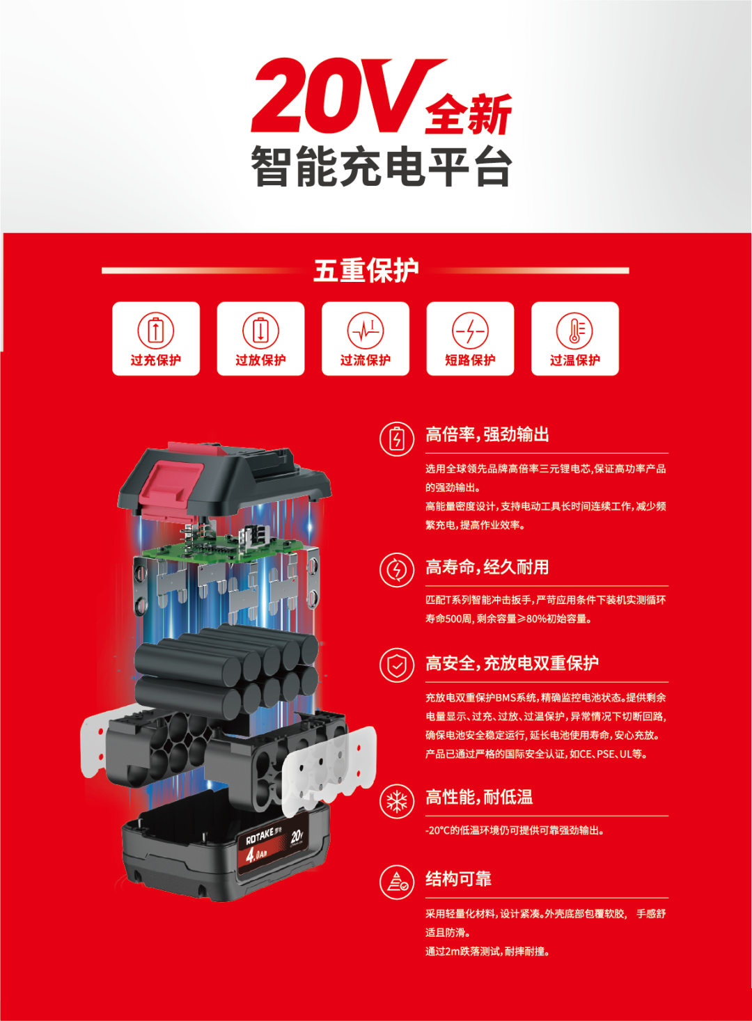 罗特20V电池包不止于通用,其核心性能更是为各种复杂工况而生: